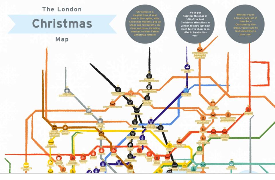 Une agence en ligne a pensé qu’il était plus que nécessaire de créer une carte afin de regrouper toutes les meilleures attractions liées à l’esprit de Noël ; un peu dans la même logique que la carte Tourist Shopping attraction tube Map , à la différence que cette nouvelle carte de noël indique directement les différentes attractions liées aux festivités de noël : c'est The London Christmas Tube Map Attractions